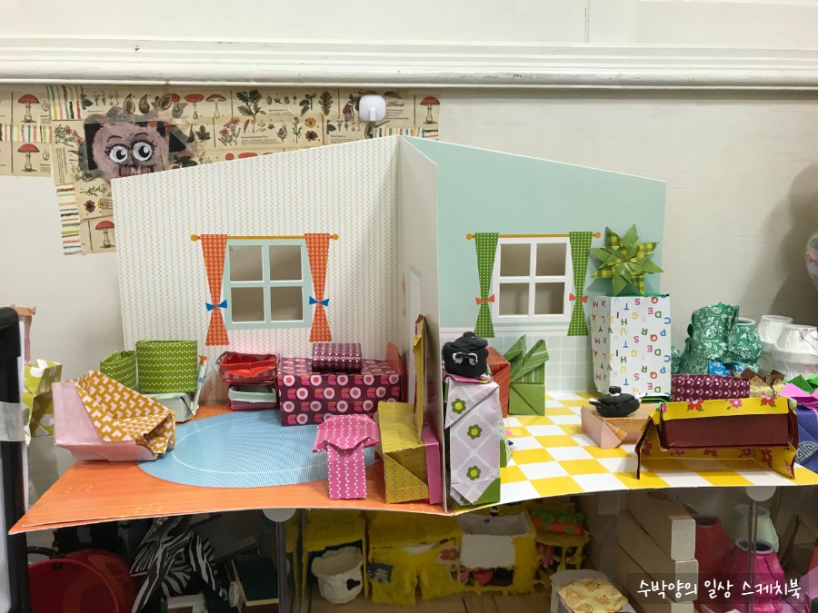 아파트 꼭대기는 종이접기 인형놀이집으로 꾸몄고